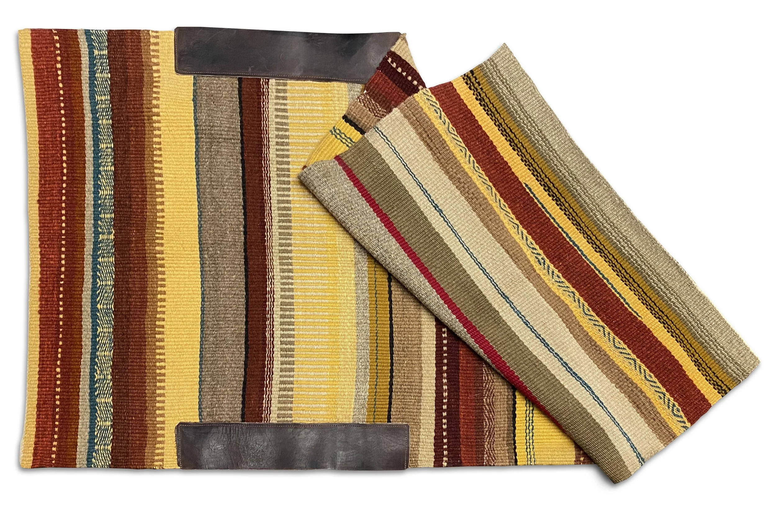 A large double blanket measuring 64 × 35 inches. This size is popular with cowboys who ride long distances and want extra protection for their horses' backs. This is also a popular size for home decor, being displayed on chairs, couches, and at the end of beds. All the colors come from plants Linda has collected on her family ranch and in her many flower gardens. The rust colors come from acorns and oak galls. The red comes from rock lichen and cochineal insects. The yellow shades come from sunflowers, daisies, and hollyhocks, the blue from her indigo gardens. The tans, browns, and greys are natural churro sheep colors.
