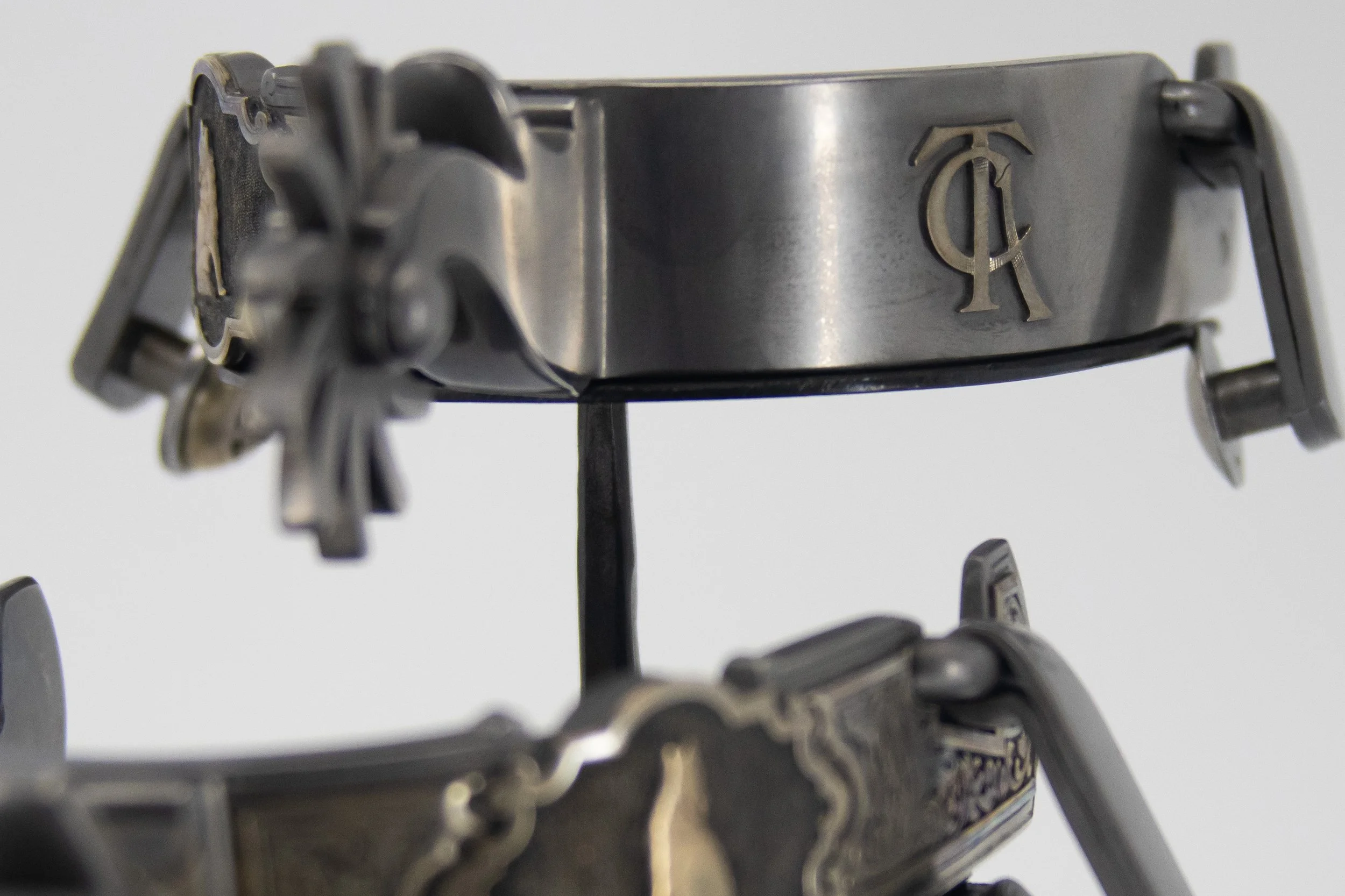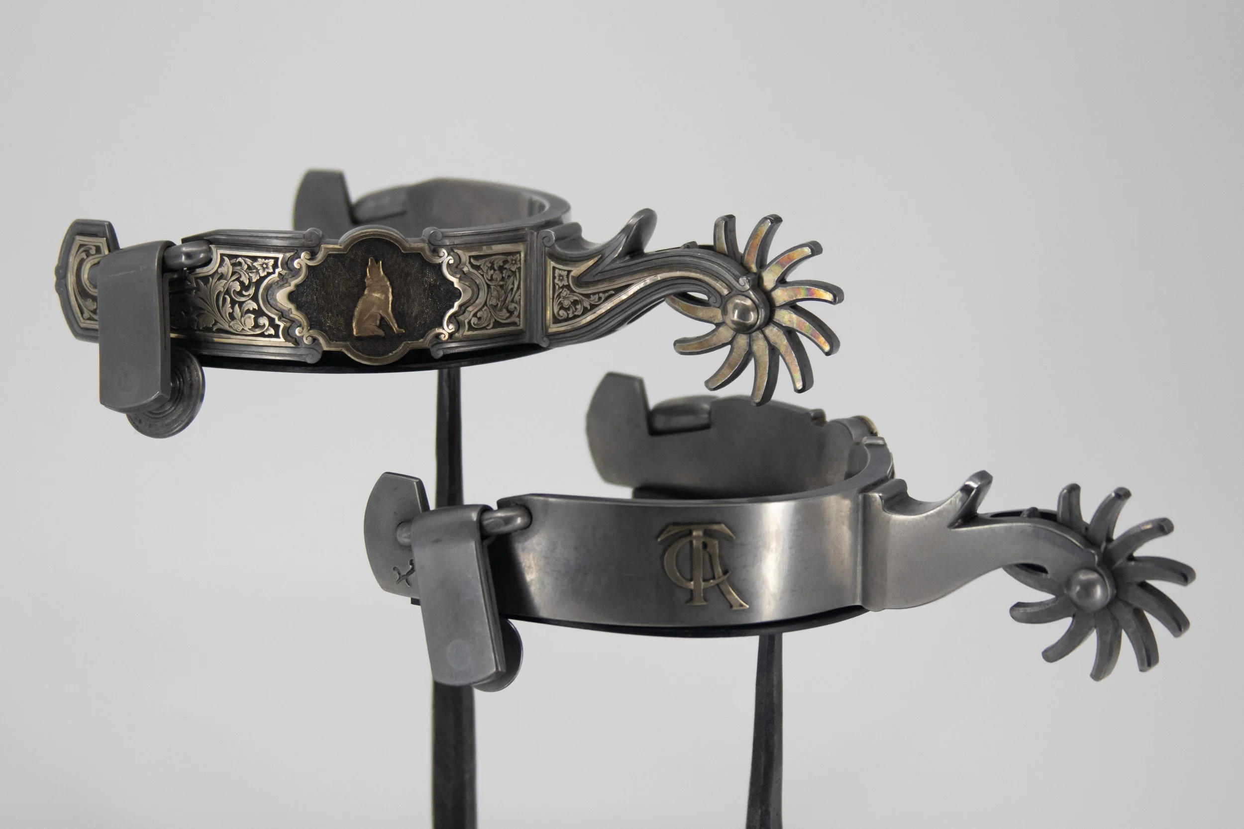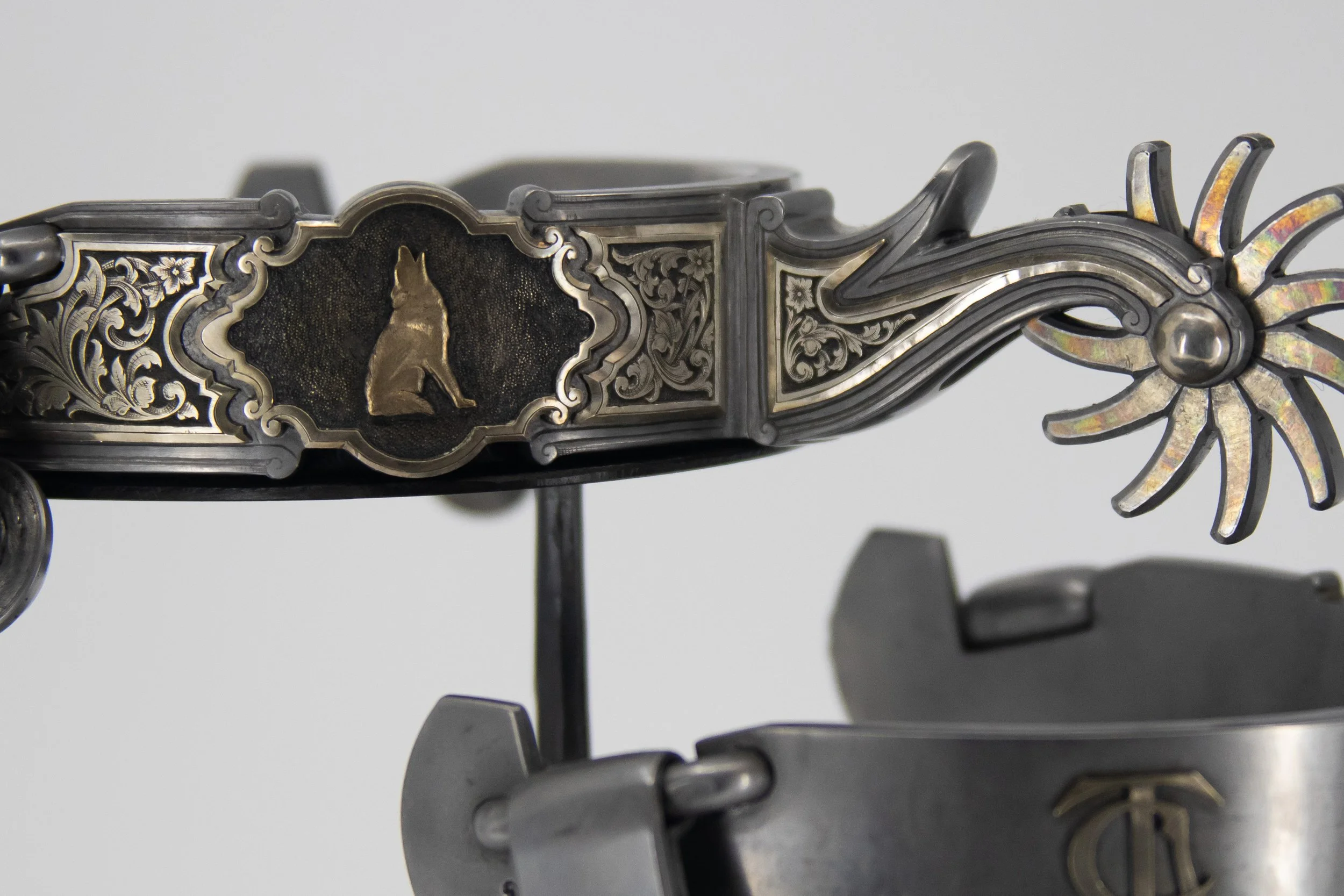"Growing up there wasn’t anything that scared me anymore than hearing a close coyote sing their song. Each one has a different tune that could send me under the covers in a ball. Today their howling creates a different emotion in me. It represents a resilience and determination to survive regardless of the changes the environment offers. The coyote is a survivor and adapts to whatever is going on around them. One of my favorite animals without question. I sculpted the coyote in 14k gold with relief engraved sterling silver overlays surrounding it. The rowels have fine silver inlays on curved tines representing the ever-changing journey that we all travel."