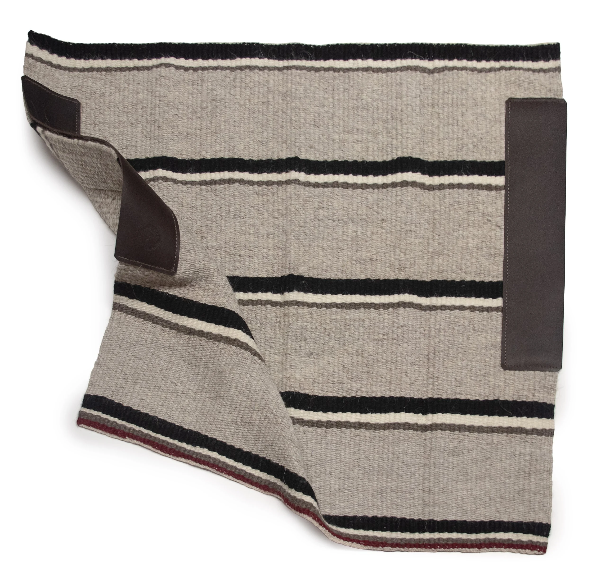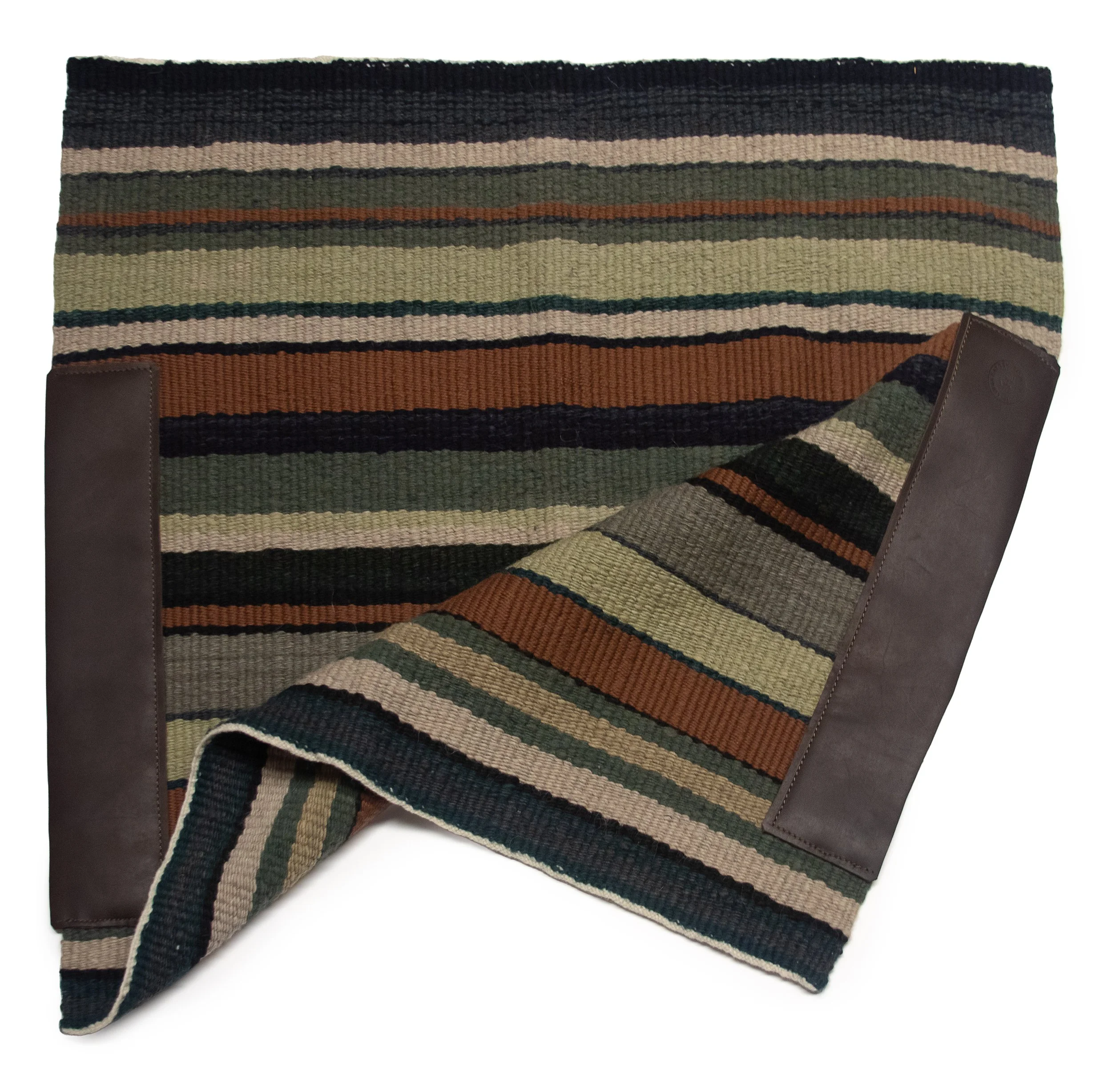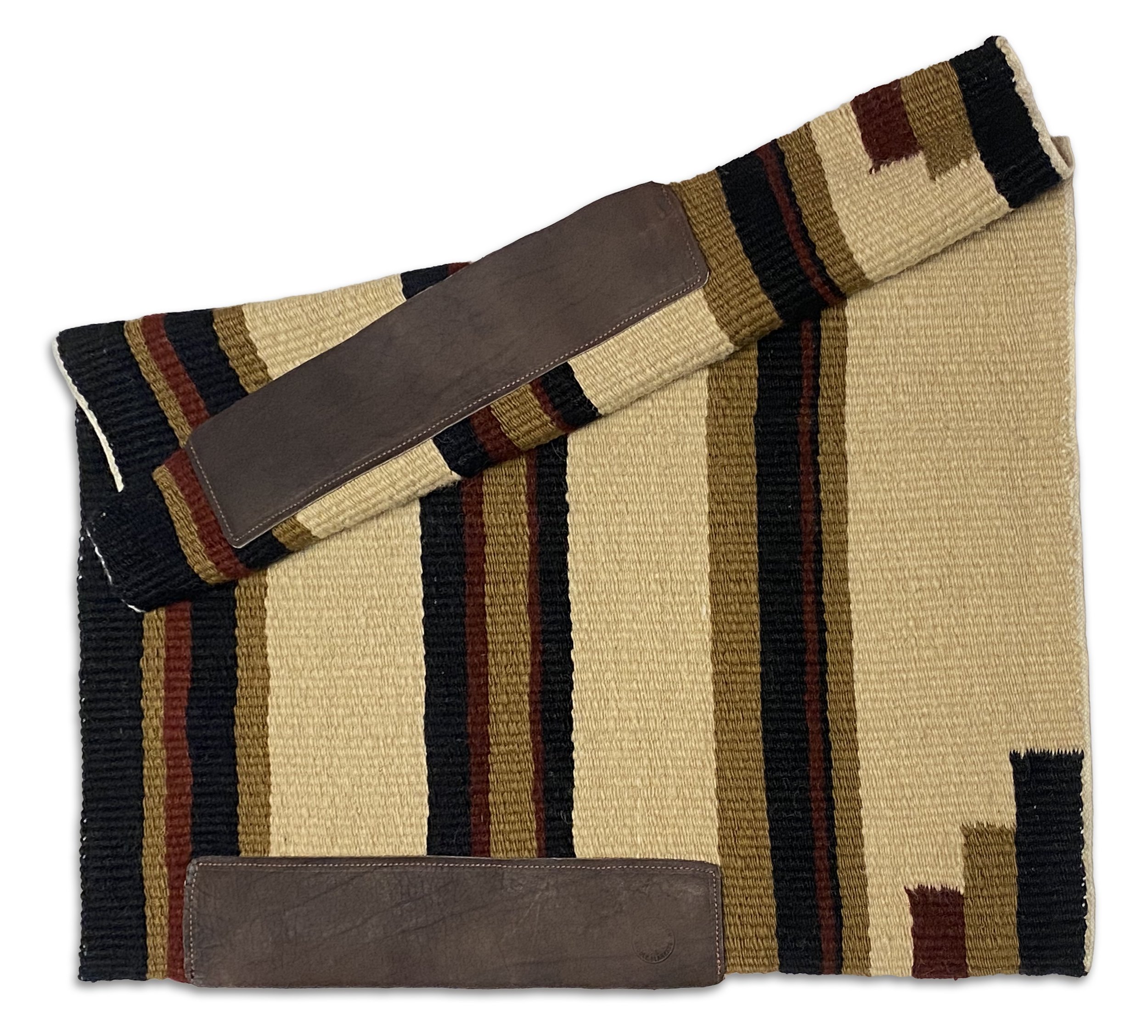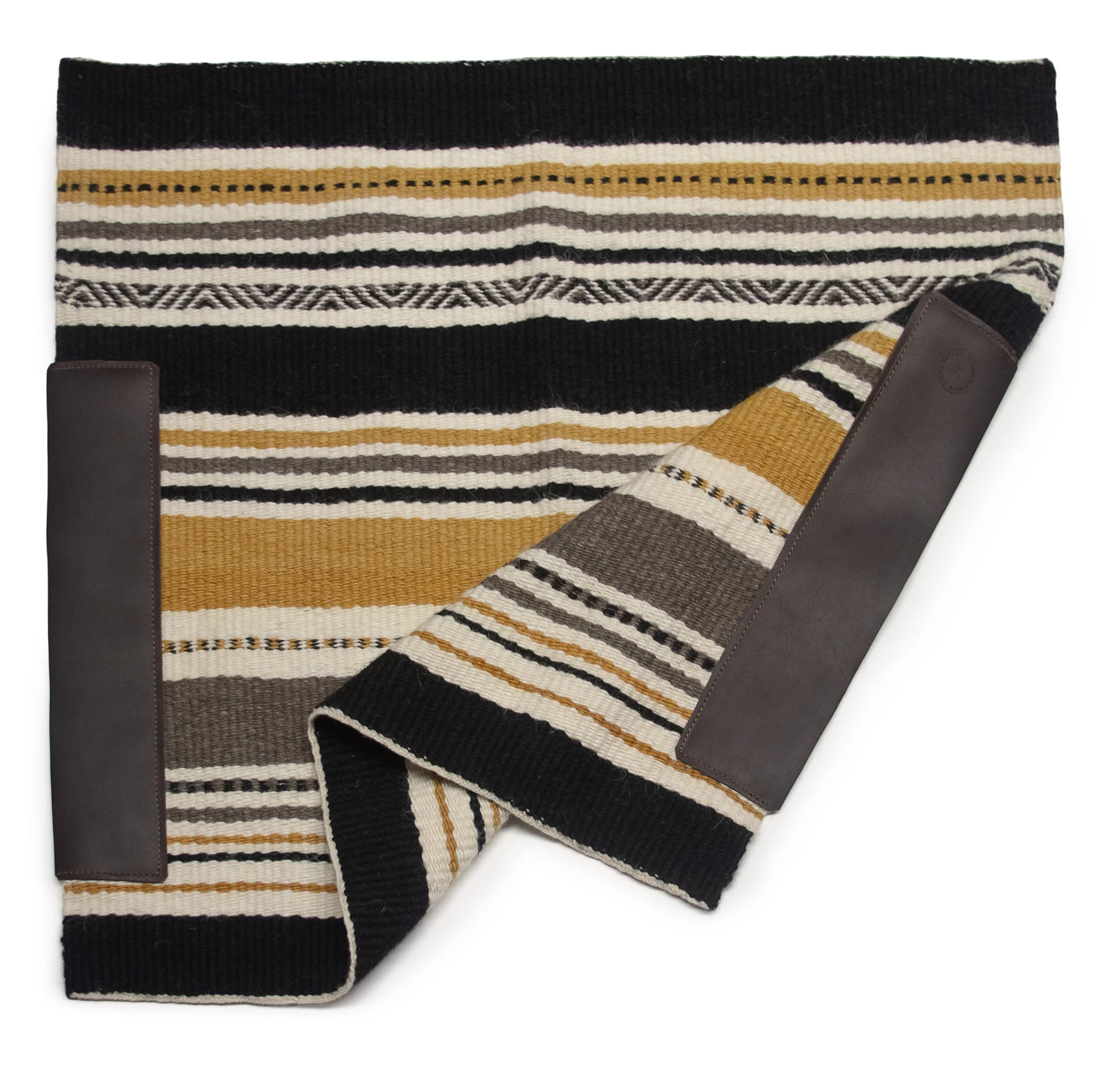 A large double blanket measuring 64 × 35 inches. This size is popular with cowboys who ride long distances and want extra protection for their horses' backs. This is also a popular size for home decor, being displayed on chairs, couches, and at the end of beds. All the colors come from plants Linda has collected on her family ranch and in her many flower gardens. The rust colors come from acorns and oak galls. The red comes from rock lichen and cochineal insects. The yellow shades come from sunflowers, daisies, and hollyhocks, the blue from her indigo gardens. The tans, browns, and greys are natural churro sheep colors.