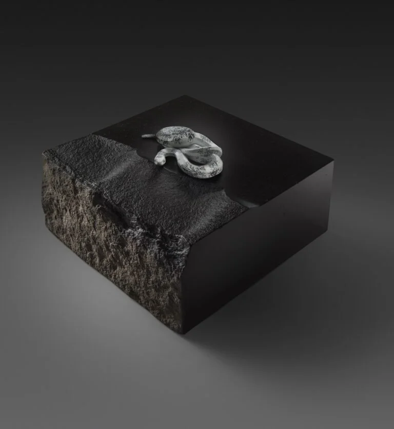 The World Was Flat…Until…, dendritic soapstone and basalt, 4.25 x 7.75 x 7.25.