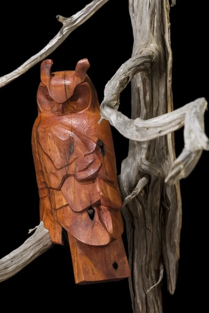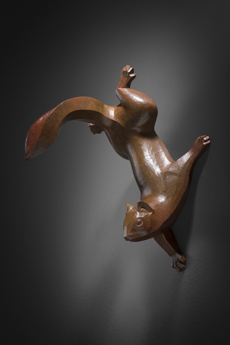 Perhaps the first thing to know about O’Gormley is that he has a profound reverence for nature. This respect is accompanied by a serious concern for the current precarious, ecological state of the natural world. For example, the artist uses only dead fallen wood for his pieces. He always takes care not to harvest living wood, and he collects much of the raw materials for his work from his immediate surroundings. O’Gormley’s menagerie is fashioned from juniper, maple, black walnut and red cedar, among others. From his wood originals, the artist also makes molds for limited bronze editions.