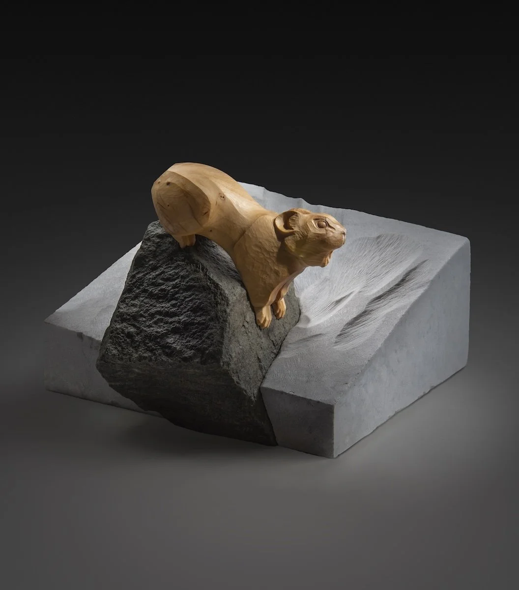 Last (Ochotona princeps), Mountain Hemlock (Tsuga mertensiana), Cascadian alpine fieldstone and Alaskan marble, 8.5 x 13.75 x 12.