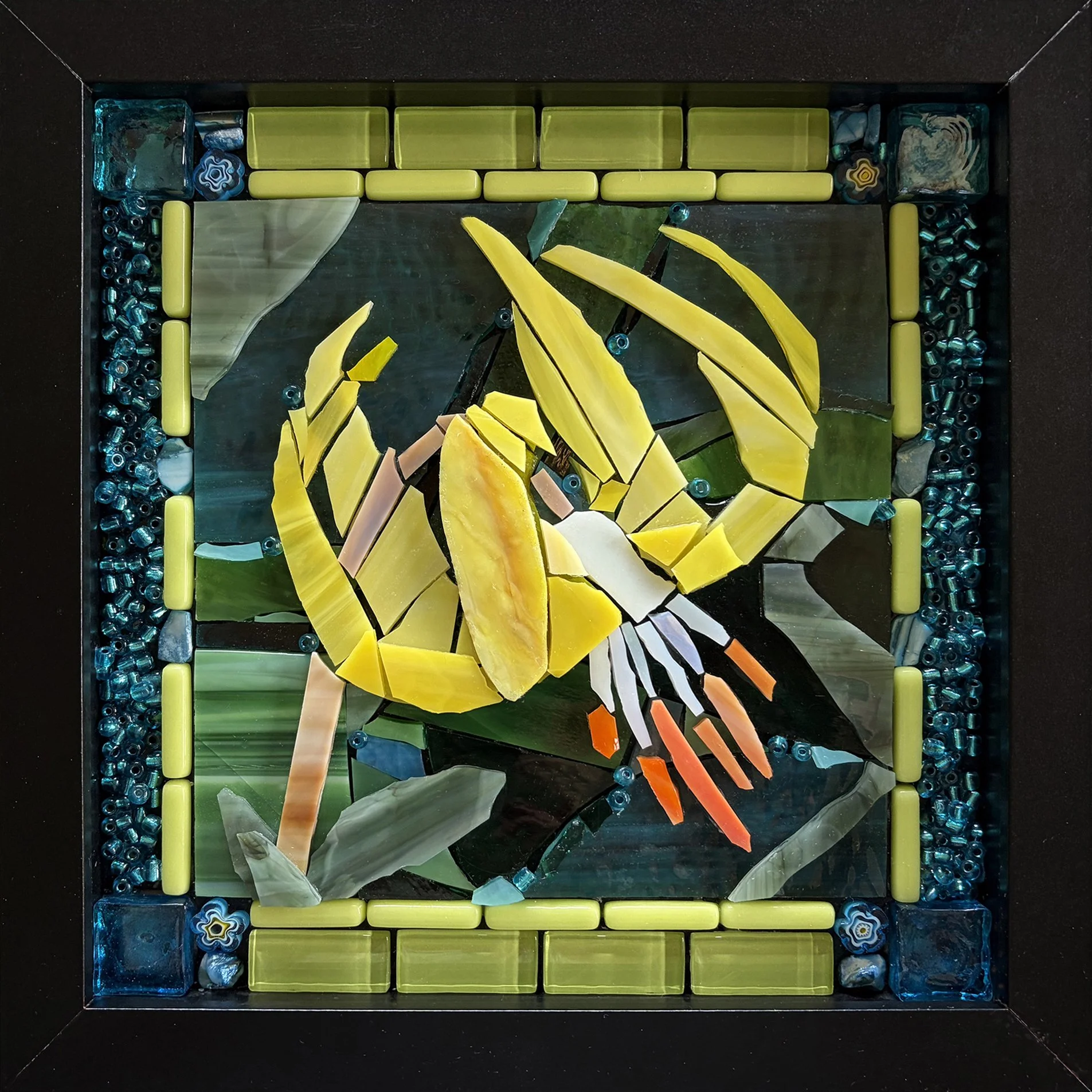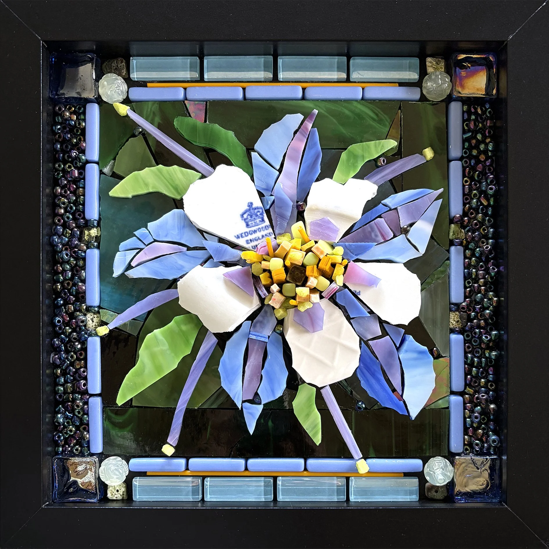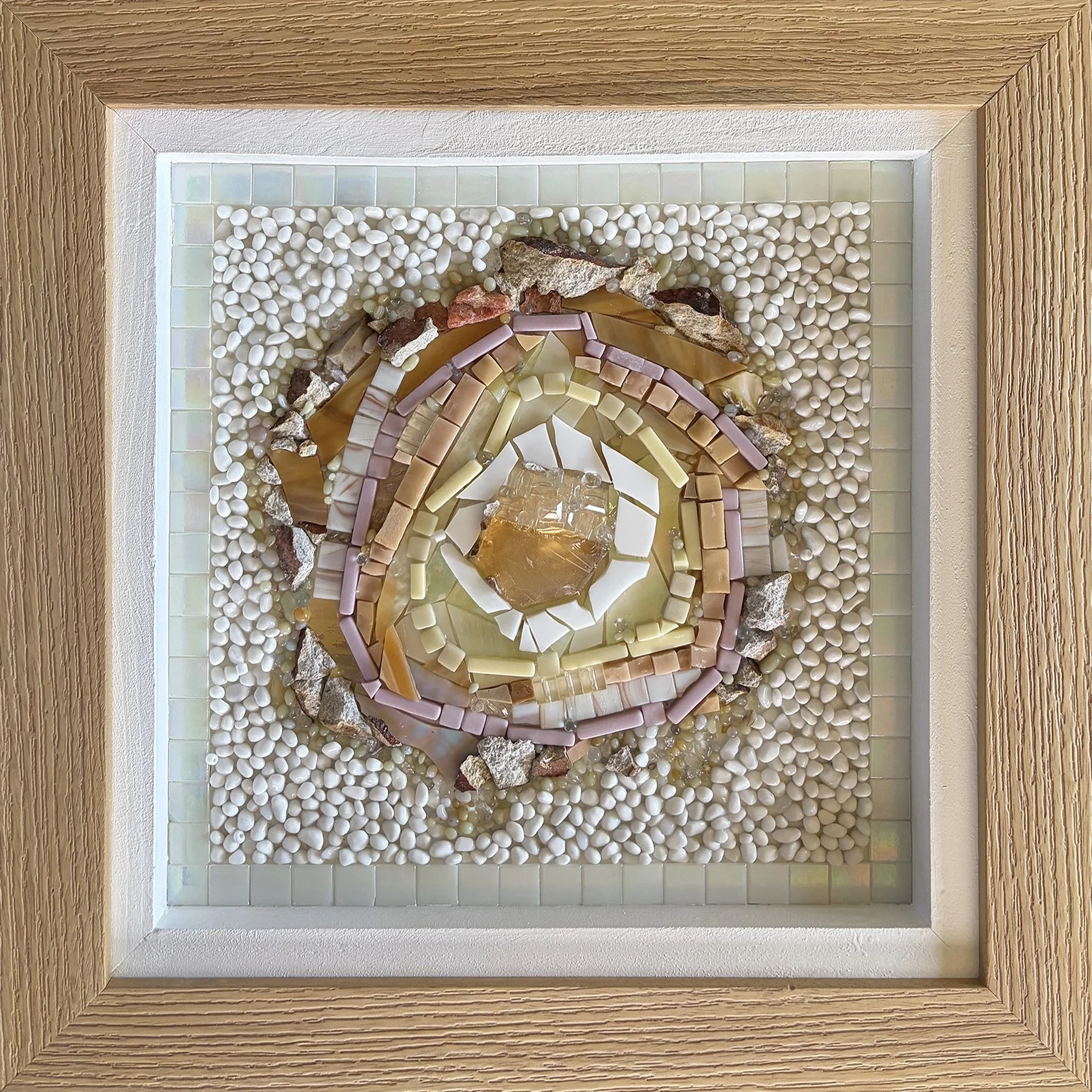 Each mixed-media mosaic artwork is thoughtfully and spontaneously assembled by me. The materials inspire each design. All artwork is up-cycled, art-cycled or recycled. I create new beauty from discarded items and materials! My daily walks are treasure hunts for forgotten and natural objects which are included in each mosaic artwork—a flattened bottle cap, broken fender, crushed reflector, glass bottle, pebbles, dried pods, even coins! You'll find vintage materials utilized as well, items saved and stored in boxes now find new life in these artworks! And of course mosaic tiles, ceramic tiles, stained glass, and a variety of beads are always part of the mosaic-collage process.